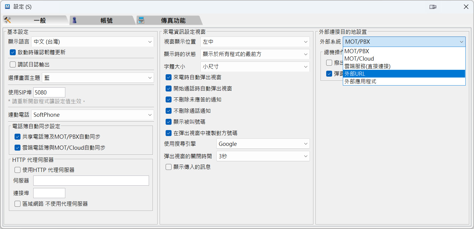 設定1:開啟 MOT/Phone POP-UP 應用程式的設定。