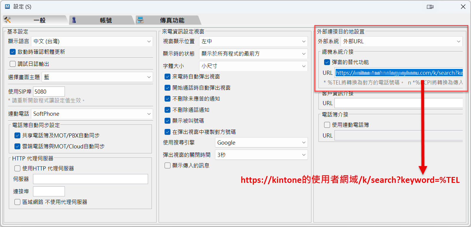 設定3:將顯示「外部URL」的設定項目。勾選「作為彈跳視窗的替代功能使用」。在 URL 欄中輸入「https://您所使用的 kintone 網域/k/search?keyword=%TEL」。
