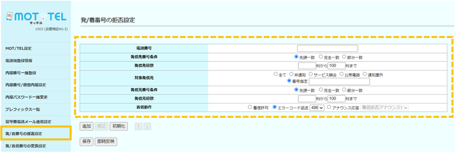 透過設定來電拒接/發話限制,可以防止騷擾電話或不必要的推銷電話,減少業務干擾並緩解人手不足。 顯示「拒接/允許發話號碼設定」畫面後,依照想設定的內容輸入相關資訊即可。