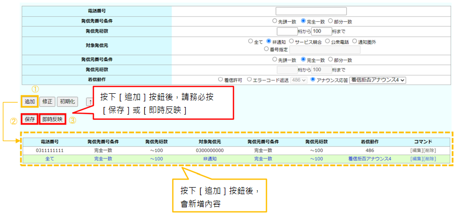 「拒接/允許發話號碼設定」每個租戶最多可登錄 1000 筆。