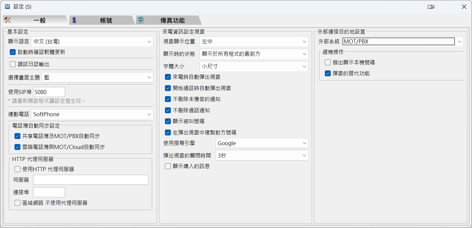 設定1:開啟 MOT/Phone POP-UP 應用程式的設定。