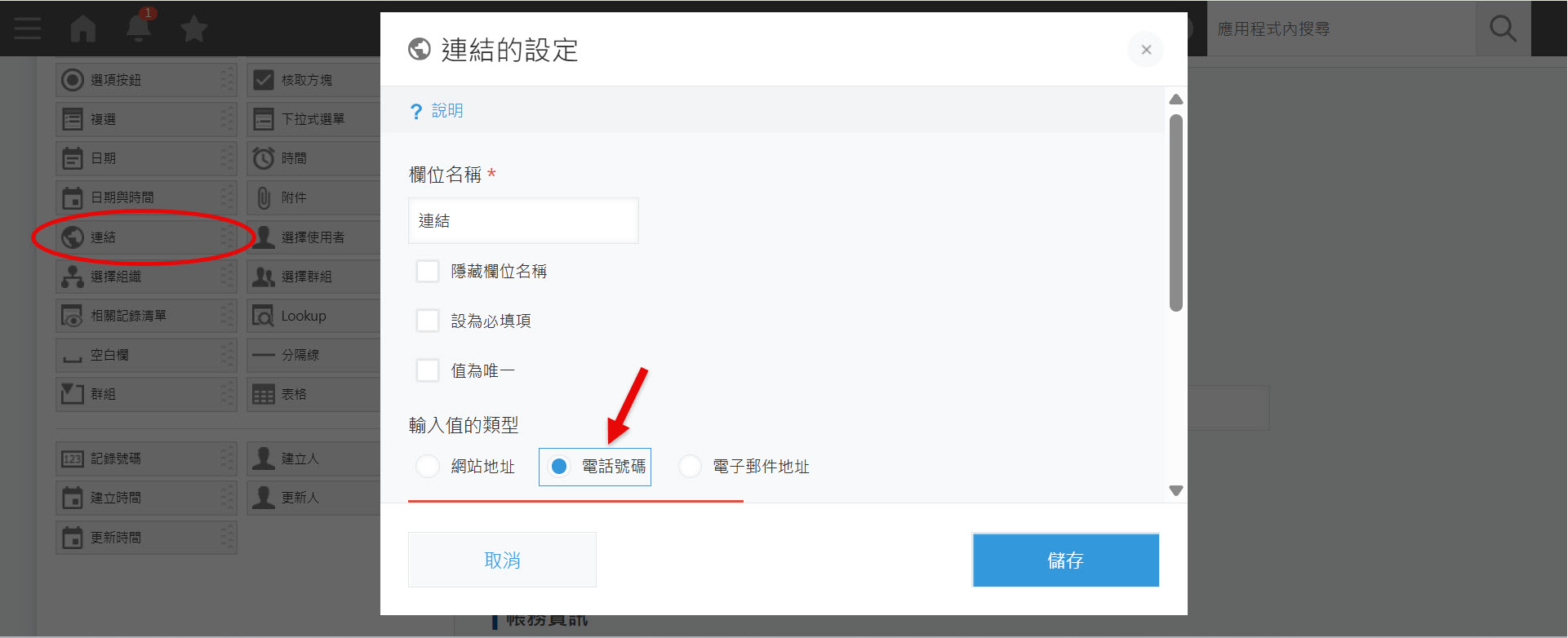 ※需要在 kintone 的「應用程式」中預先設置對應電話號碼的欄位,並在「連結」的輸入值類型中選擇「電話號碼」。